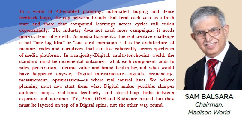 In sum, the PMAR leaves the copywriters, the ad czars and the like much to chew about. In its forecast across base, bullish and conservative scenarios, PMAR sees 2027 ad spend (Legacy Definition ) landing in a realistic band of ₹1,25,000–1,40,000 crore, with ₹1,32,000–1,35,000 crore as the highest‑probability base. The exact outcome, it posits, will depend on macro conditions, regulation, execution of policy and shocks, but the underlying picture is clear: India is becoming a majority‑Digital, AI‑influenced, systems‑driven advertising market, with new engines and policy tailwinds offsetting legacy headwinds. In that context, the real risk is not that the market stops growing; it is that advertisers cling to pre‑2020 playbooks while growth flows to those who re‑engineer their systems around these five forces.