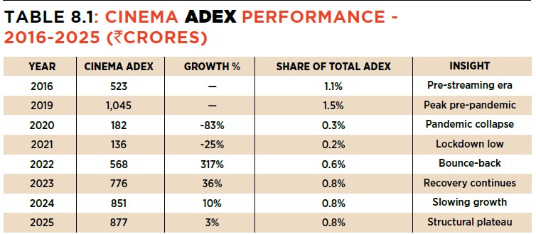 It is in this light, one finds that according to the PMAR 2026 report/survey, the cinema advertisement expenditure in 2025 just about stabilised at around ₹877 crores, leading to the summation that the post-pandemic rebound has been now largely played out and that the (cinema) medium has reached its structural plateau. With the result the value derived from cinema advertisements back in a narrow band wherein blockbuster-led spikes are offset by quieter quarters, with overall share remaining small compared to TV, digital and OOH (out of home) segments.
