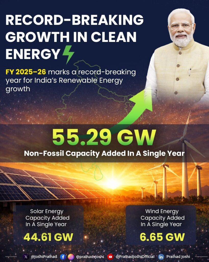 Non-Fossil capacity addition in 2025-26 is 55.29 GW and this is the highest increase in any year. (Previously the highest increase was 29.5 GW during 2024-25).