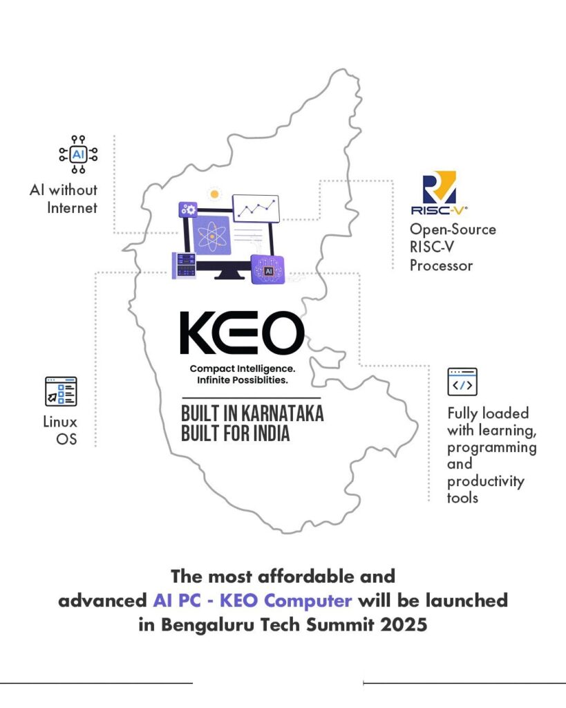 Today, the Dept. of E, IT & BT, along with KEONICS, introduced: KEO: Knowledge-driven, Economical and Open-source. A first-of-its-kind AI personal computer designed and developed entirely in Karnataka. It is a compact, affordable and AI-driven mass-computing system that serves as an inclusion device, built on an open-source RISC-V processor and loaded with full computing features, including an on-device AI engine – BUDDH for syllabus-aligned learning support.