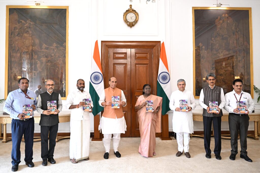 Raksha Mantri, Shri Rajnath Singh, along with Minister of Information & Broadcasting, Shri Ashwini Vaishnaw and Minister of State for Information & Broadcasting, Dr L. Murugan, presented first copies of the second volume of the books ‘Wings to Our Hopes’ and ‘Aashaon Ki Udaan’ to the President of India, Smt. Droupadi Murmu at Rashtrapati Bhavan. Officials from the Directorate of Publications Division and the Ministry of Information and Broadcasting were also present on the occasion.