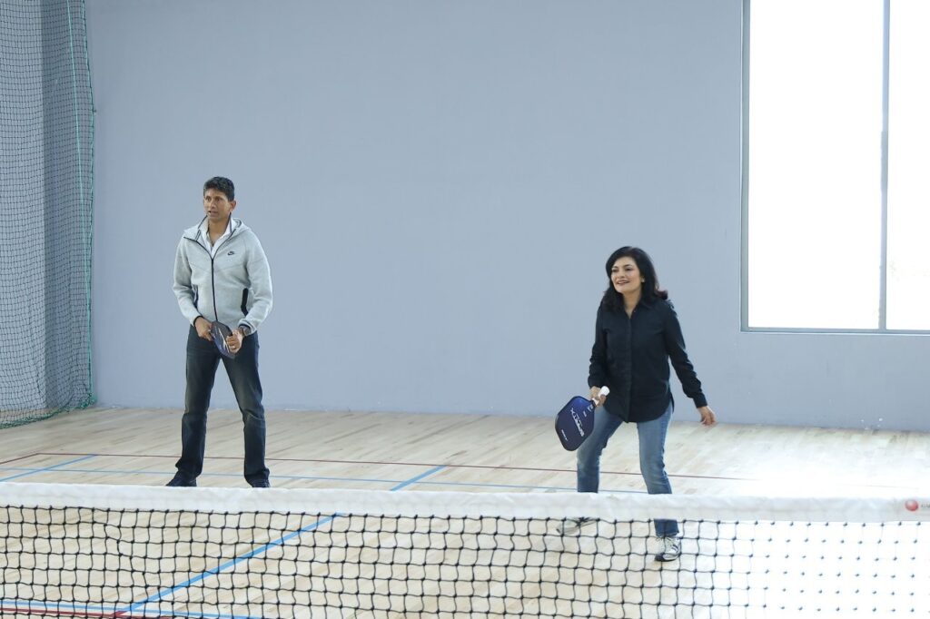 The indoor complex includes two dedicated badminton courts and a multipurpose court that supports both badminton and pickleball. It also features a squash court, a golf simulator, and indoor games such as table tennis, foosball, chess, and billiards.