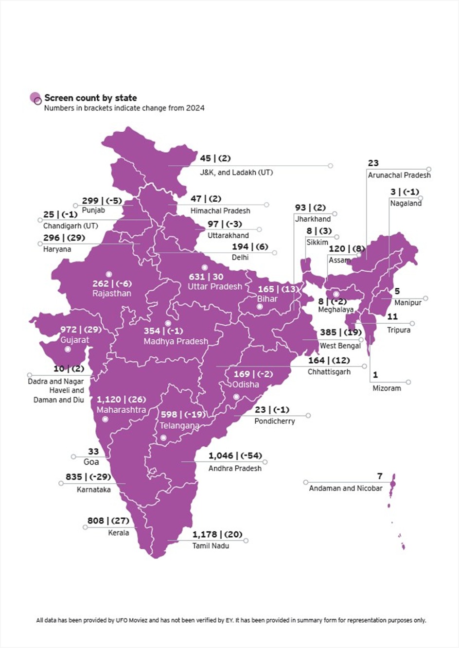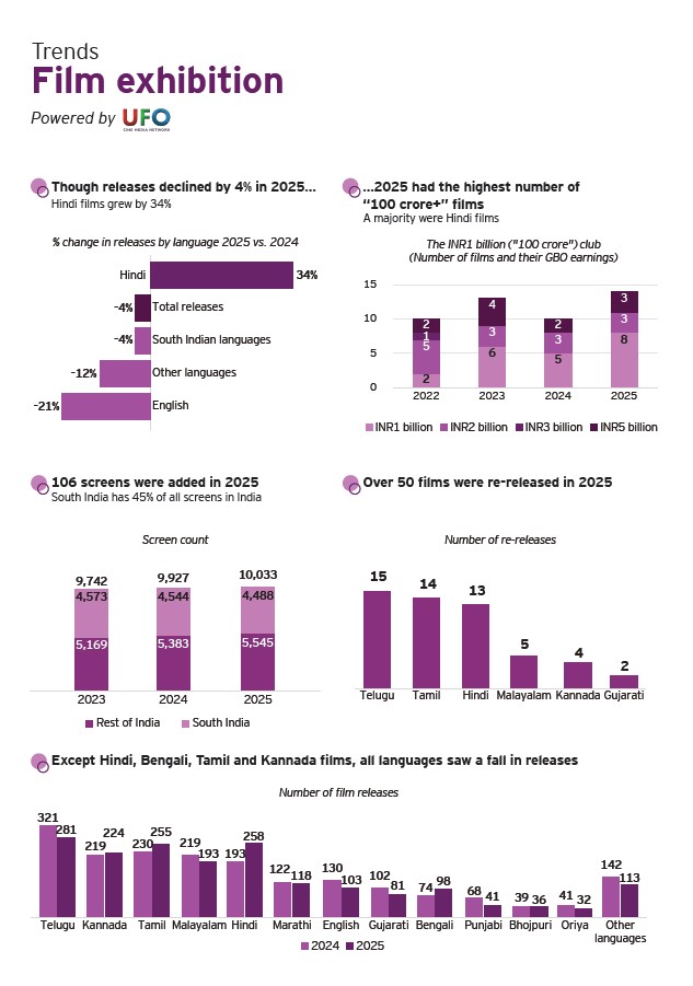 The year gone by saw screen count increase by one per cent to reach 10,033 screens, with a one per cent fall in South Indian states while registering a 3 per cent growth in the rest of India. While 240 screens were added during 2025, 124 screens were shut down, mainly single screens. Despite the increase in screen count, the country’s screen density – at 6.8 screens per million population – continues to remain extremely low compared to other countries such as the US (109), the UK (66), France (95) and China (64), states the findings.