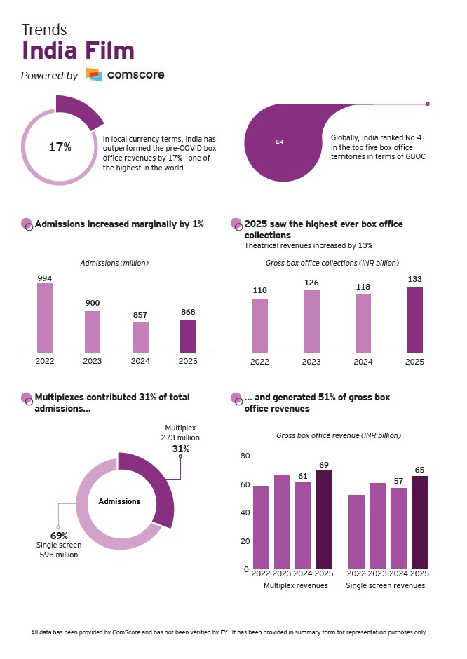 According to the report, stable footfalls and rising ticket prices have helped the growth of theatrical revenues in the country in the year gone by (2025) seeing as many as 1,972 films released and theatrical revenues soaring 14 per cent with the segment posting a record ₹205 billion notching up a nine per cent growth as against previous year’s (2024) ₹187 billion.
