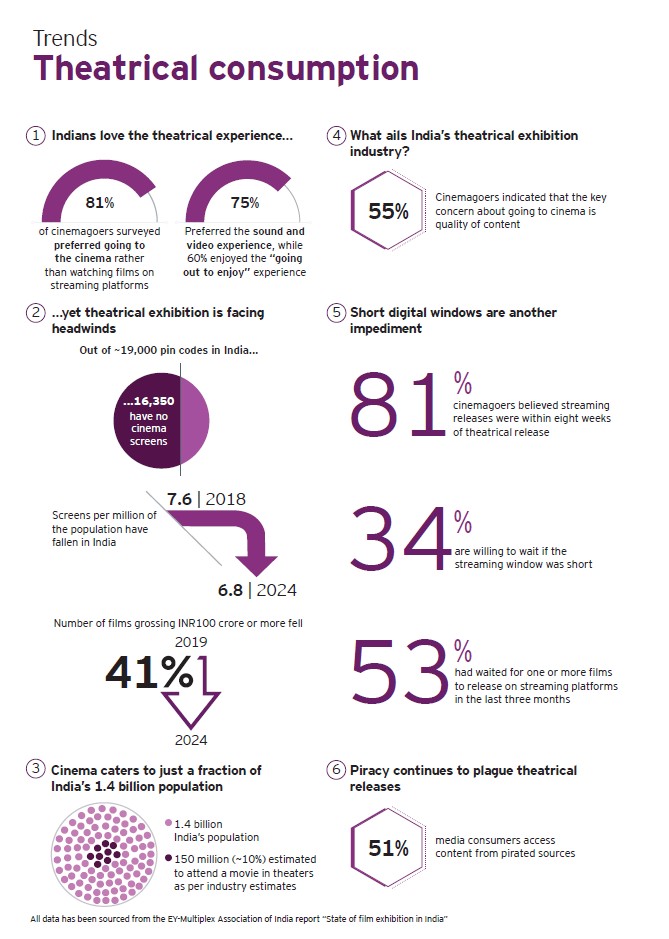 Observing that films are evolving into multi-platform intellectual properties with extended digital lifecycles, the report states that filmed entertainment is expected to grow based on increases in the number of screens as well as more high-concept spectacular films (both Indian and Hollywood), growth of adult animated and anime films, and a rebound in digital rights values.