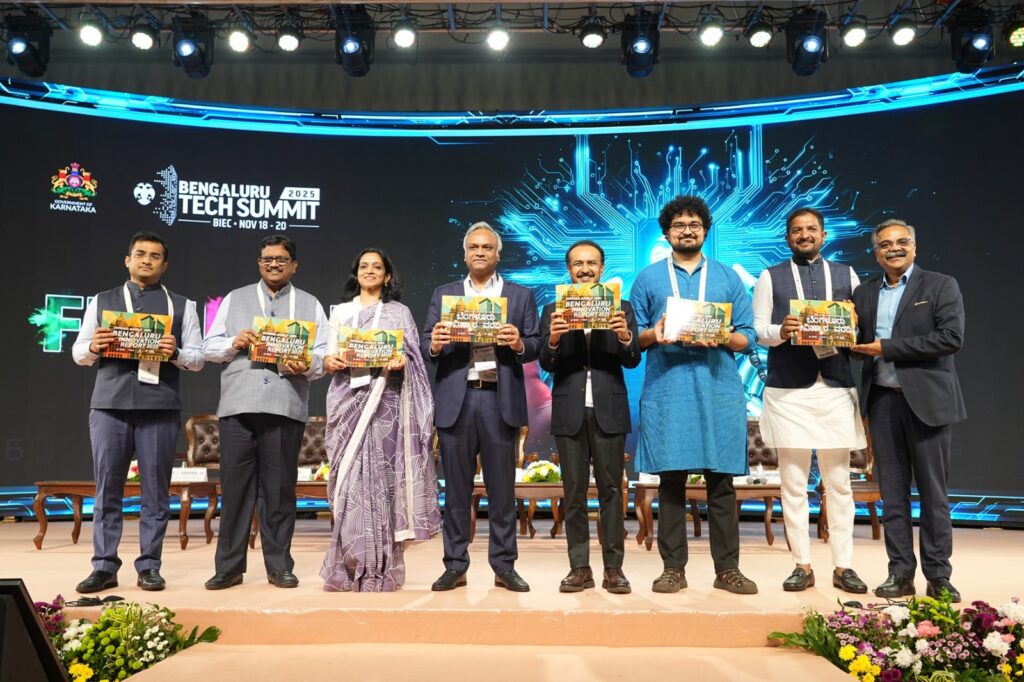 Shri Rahul Sharanappa Sankanur, IAS, Director, Dept. of Electronics, IT & Bt and Managing Director, KITS, Government of Karnataka; Dr. Manjula N , IAS, Secretary to Government, Department of Electronics, IT, Bt & S&T, Government of Karnataka; Shri Priyank Kharge , Hon’ble Minister for Information Technology, Biotechnology and Rural Development & Panchayat Raj, Government of Karnataka; Shri Prashanth Prakash , Founding Partner, Accel India; Chairman, Vision group on Startups- Government of Karnataka; Shri Sharath Kumar Bache Gowda , Chairman, KEONICS, Government of Karnataka and other dignitaries releasing Bengaluru Innovation Report 2025 at Bengaluru Tech Summit 2025.